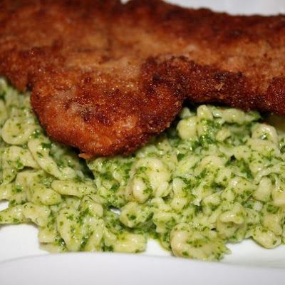 Here we have a pork chop, also known as schnitzel in German cuisine, pounded to 1/4-inch thick, breaded, and then pan fried in Fresh Harvest Extra Virgin Olive Oil until golden brown and delightfully crisp. It is served on a bed of simple, homemade pasta and the delicious Arugula-Lemon Pesto. You can use any type of small pasta if you don’t have the time or inclination to made the homemade Spaetzle Pasta, but it’s pretty easy to do!